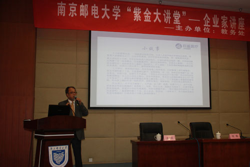 10月15日下午,由教务处主办、地理与生物信息学院承办的南京邮电大学“紫金大讲堂”――企业家讲座第十次活动在仙林校区行政楼一楼报告厅顺利举行。南京巨鲨集团董事长王卫先生应邀莅临“紫金大讲堂”,为同学们带来题为“未来与梦想——关于大学生就业和职业规划的探讨”的精彩讲座。讲座由地理与生物信息学院院长胡栋教授主持。