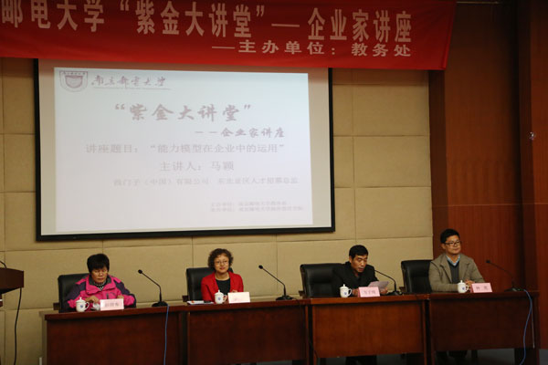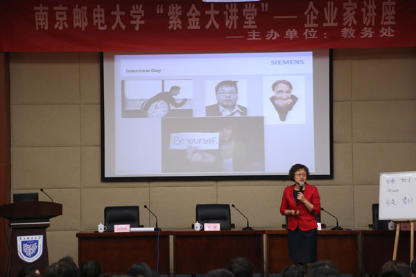 11月14日下午,由教务处主办、海外教育学院承办的南京邮电大学“紫金大讲堂”――企业家讲座第十三次活动在仙林校区行政楼一楼报告厅举行。本次活动邀请到了西门子(中国)有限公司东北亚区人才招募总监马颖女士,马女士为同学们带来了题为“能力模型在企业中的运用”的精彩讲座。讲座由海外教育学院方子纯副院长主持。