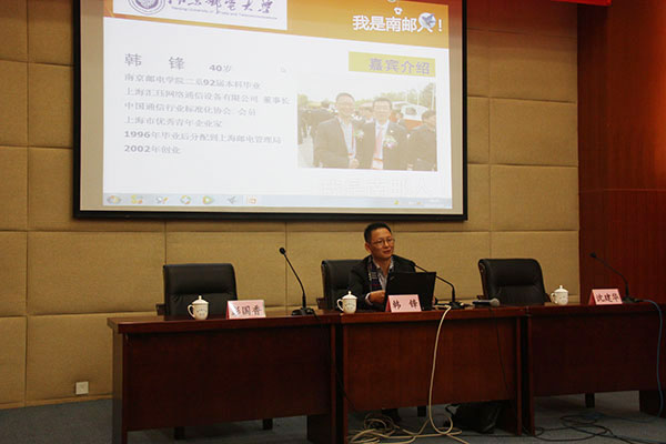 韩锋董事长介绍了公司的概况,在谈及创业背景时,回顾了在南邮的学习生活、毕业后在国有企业的工作经历以及自主创业的奋斗历程。在介绍创业心得时,强调了专业基础、情商、团队、心怀感恩等对于创业的重要性。韩锋董事长深情地提及,在自己整个创业过程中,受到很多南邮毕业的师兄师姐的帮助,“我是南邮人”的主题始终贯穿于讲座始终。互动环节中,韩锋董事长耐心回答了同学们的提问,对希望自主创业的学生提供了有益的经验和忠告。建议同学们重视大学期间的学习经验、社团工作经历以及社会实践,充分利用南邮毕业的师兄师姐的人脉,为自己将来的创业创造条件。