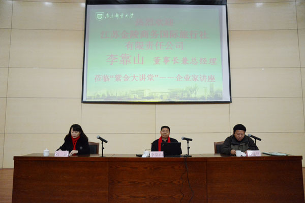 为了开拓学生的视野,使得学生对旅游产业有深入的认识,由教务处主办、外国语学院承办的南京邮电大学“紫金大讲堂”――企业家讲座第十六次活动于12月12日下午在仙林校区图书馆四楼报告厅举行。江苏金陵商务国际旅行社有限责任公司董事长兼总经理李靠山先生应邀莅临“紫金大讲堂”,给同学们带来了题为“旅行社经营模式的变革及其发展趋势”的精彩讲座。讲座由外国语学院赵建红副院长主持。