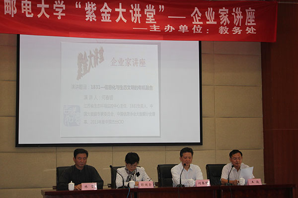 10月10日下午,由教务处主办、地理与生物信息学院承办的南京邮电大学“紫金大讲堂”――企业家讲座第28次活动在仙林校区行政楼一楼报告厅举行。江苏省生态环境监控中心主任何春银教授级高工莅临“紫金大讲堂”,作题为“1831――信息化与生态文明的有机融合”的讲座。讲座由地理与生物信息学院副院长王俊教授主持。