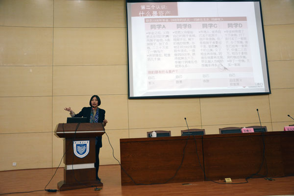 张曦元女士从如何树立正确的金钱观、理性的消费观、自觉的投资观、科学的理财观,大学生为什么要爱护自己的信用,现在应该养成哪些理财的好习惯等方面对同学们进行了财商教育。分析了过去十年的投资机会,目前宏观经济政策、投资趋势、金融行业新趋势等经济形势。引出了财商(Financial Quotient,简称FQ)的概念,即一个人认识金钱和驾驭金钱的能力,在财务方面的智力,是理财的智慧。通过同样年纪、毕业同一所学校、具有类似工作的两位毕业生5年之后的境遇比较,说明了具有不同财商观的人做出的选择会产生截然不同的资产收获,从而证明了正确认识和应用金钱和金钱规律的能力的重要性。通过具体案例进一步说明了什么是投资、什么是资产、什么是负债等知识,并给大学生提出了5个实用的理财建议。